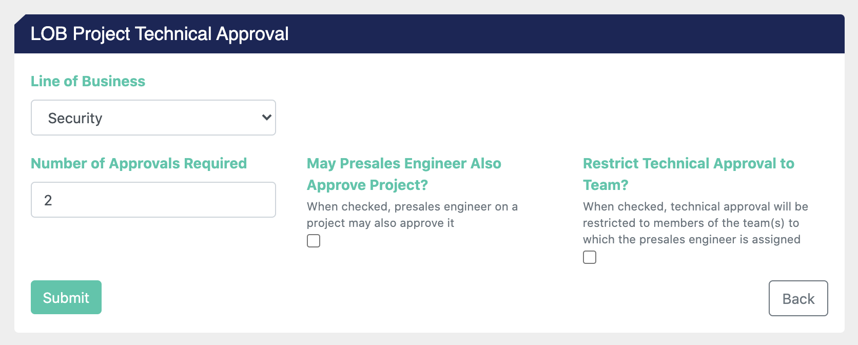 If you are using Teams, decide if you want the approval to be limited to the same team as the Presales Engineer on the project. If you restrict approval to a team, please ensure there are enough approvers from each team in the pool to satisfy the number of approvals required to approve the project.